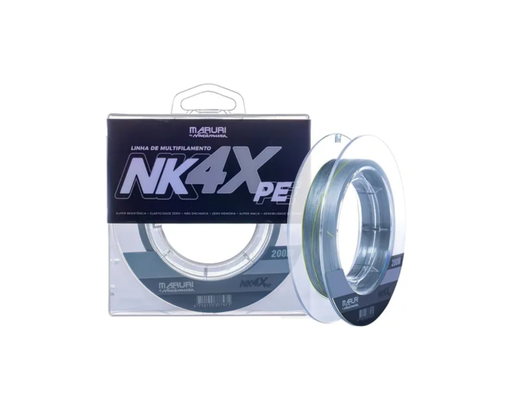 Lançamento da Maruri em parceria com o consagrado pescador esportivo Nelson Nakamura, a linha NK 4X é trançada em 4 fios de 100% PE de última geração com extrema sensibilidade e resistência a tração. Oferece tanto para o pescador amador como para o profissional, elasticidade e memória zero, ajudando a evitar assim as temidas cabeleiras e dando máxima sensibilidade nas fisgadas.